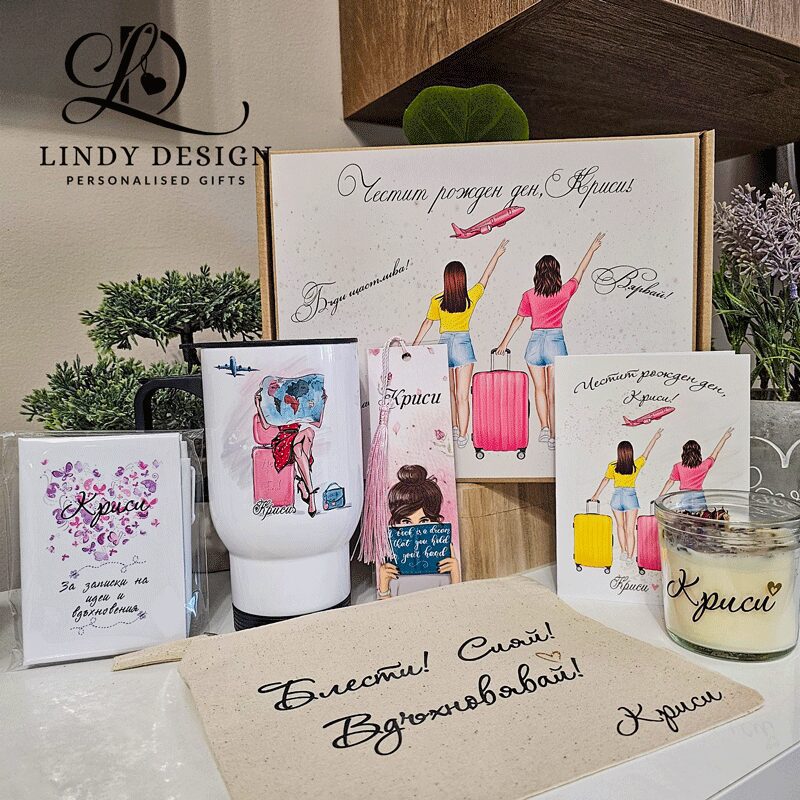С нашите персонализирани подаръчни комплекти избираш всеки елемент сама — от дизайна, чашата с име, през ароматната свещ до корицата на кутията.