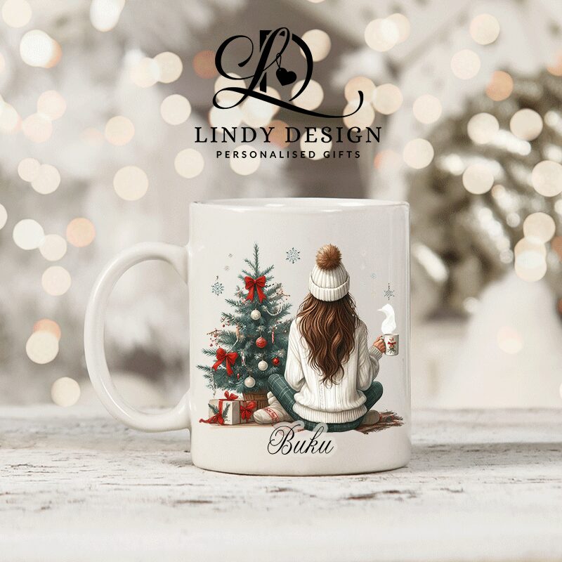 Персонализирана чаша за подарък “Момиче пред коледна елха”