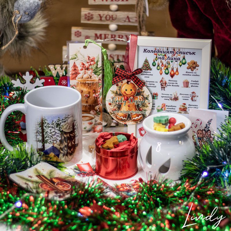 Коледен подаръчен комплект от чаша, ароматни коледни елементи, арома лампа, книгоразделител, подложка, коледен орнамент и постерче