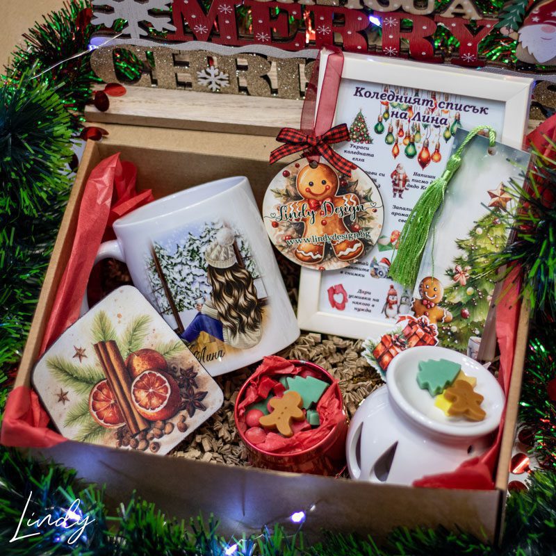 Това е една страхотна подаръчна кутия, която ще донесе много щастие у получателя и ще направи коледните празници много по-приятни! Зарадвайте своята любима приятелка, майка, баба или сестричка или себе с този персонализиран коледен подаръчен комплект! Той е създаден само да ви носи уют през коледните празници – да изпиете чаша топъл чай, да поставите ароматните коледни фигурки в арома лампата, която можете да поставите върху красивата коледна подложка и да се отпуснете в компанията на любима книга! А постерчето ще ви напомня всяка Коледа колко неща може да направите, за да усетите Коледната магия!И да не забравяме, че всяка година трябва да окичим елхата с нова играчка…