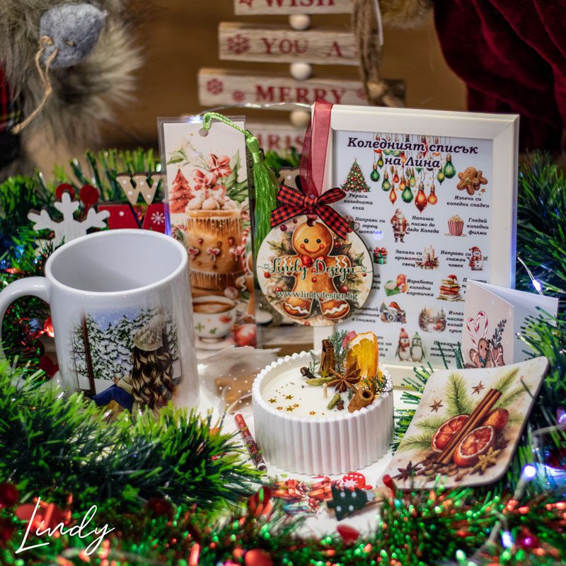 Коледен подаръчен комплект от чаша, ароматна коледна свещ, книгоразделител, подложка, орнамент за елха и постерче