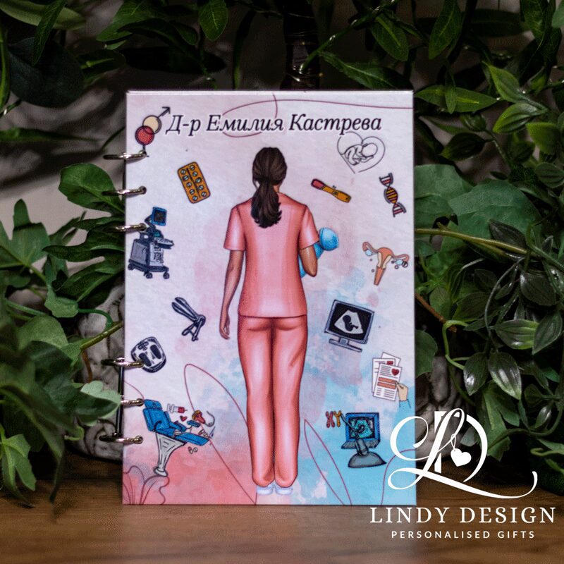 Дизайнът е в нежни розови и пастелни тонове с илюстрации, свързани с акушерството и гинекологията – символи, които носят топлина, благодарност и уважение.