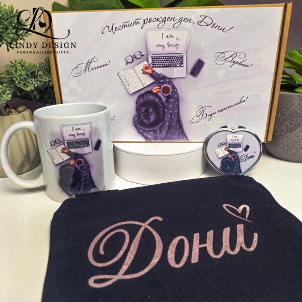 Персонализиран подаръчен комплект от чаша, бутилка и козметичен несесер