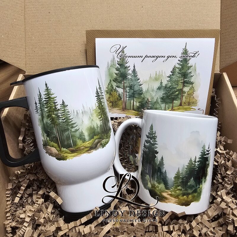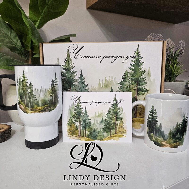 Персонализиран подаръчен комплект от керамична чаша, термо чаша и картичка