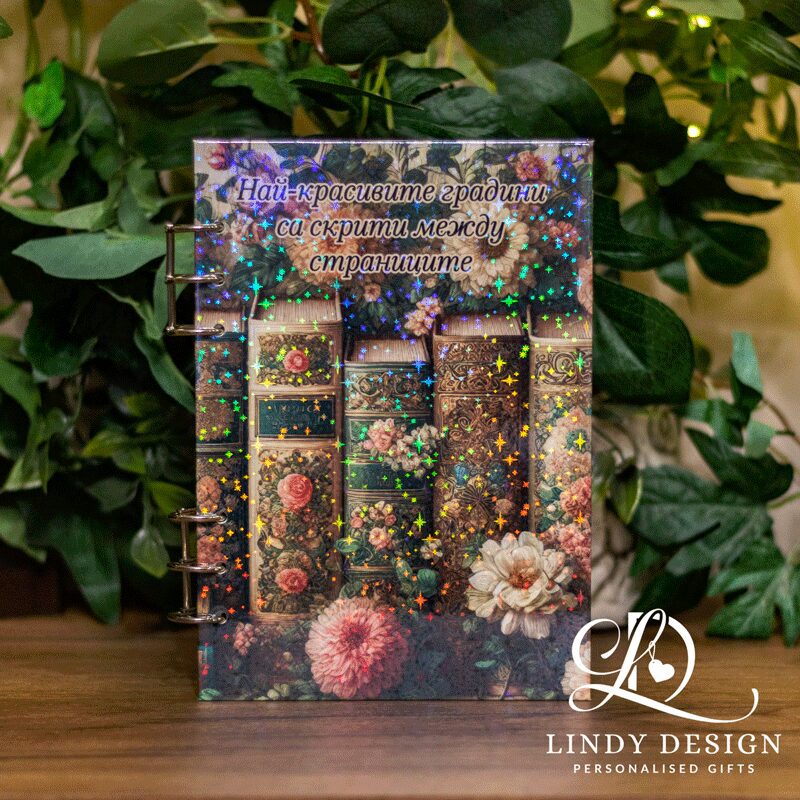 - Бележник формат А5 – 100 страници на редове, идеален за записки, дневник, планове или цитати от любими книги. Бележникът е с ламинирани брокатени корици, с отваряеми скоби, което го прави много практичен. Може да допълните още странички по всяко време.