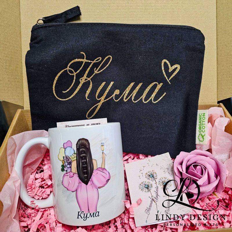 Подаръчна кутия за моминско парти – комплект от козметична чантичка и керамична чаша