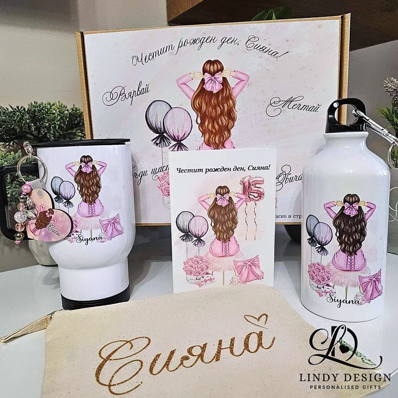 Персонализиран подаръчен комплект от термо чаша, бутилка, ключодържател, картичка и несесер