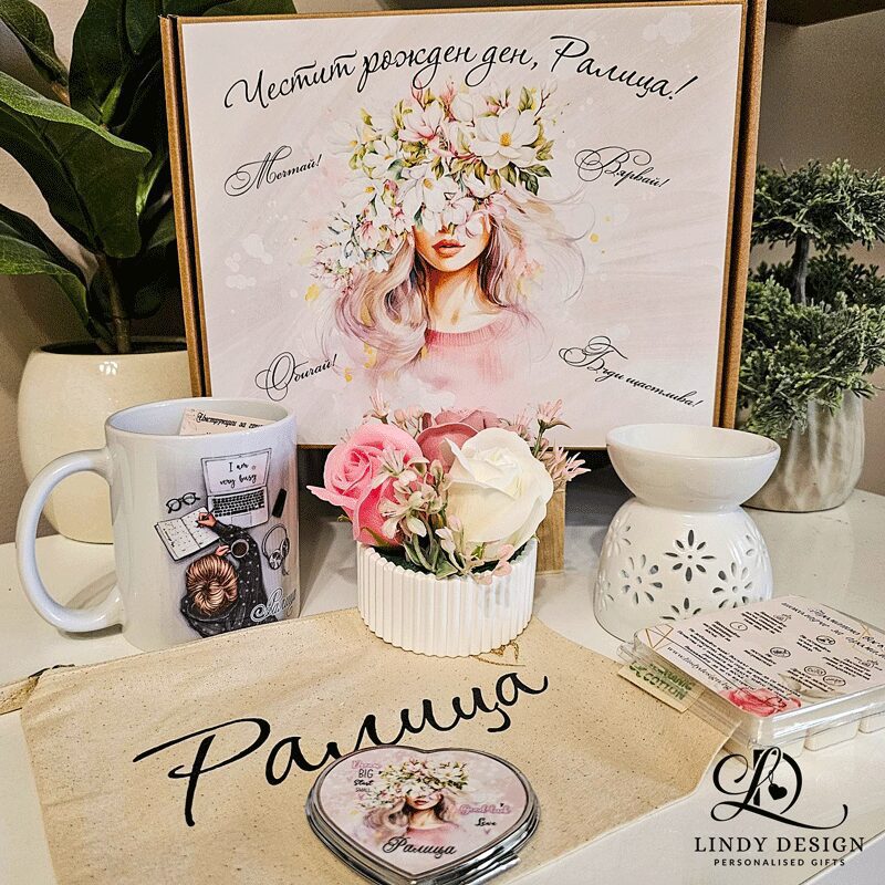 Персонализиран подаръчен комплект от чаша, огледало, козметичен несесер, цветна аранжировка, арома лампа и восъчно шоколадче