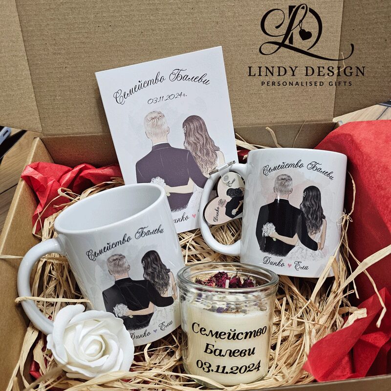 Персонализиран подаръчен комплект за сватба от два броя чаши, свещ и картичка