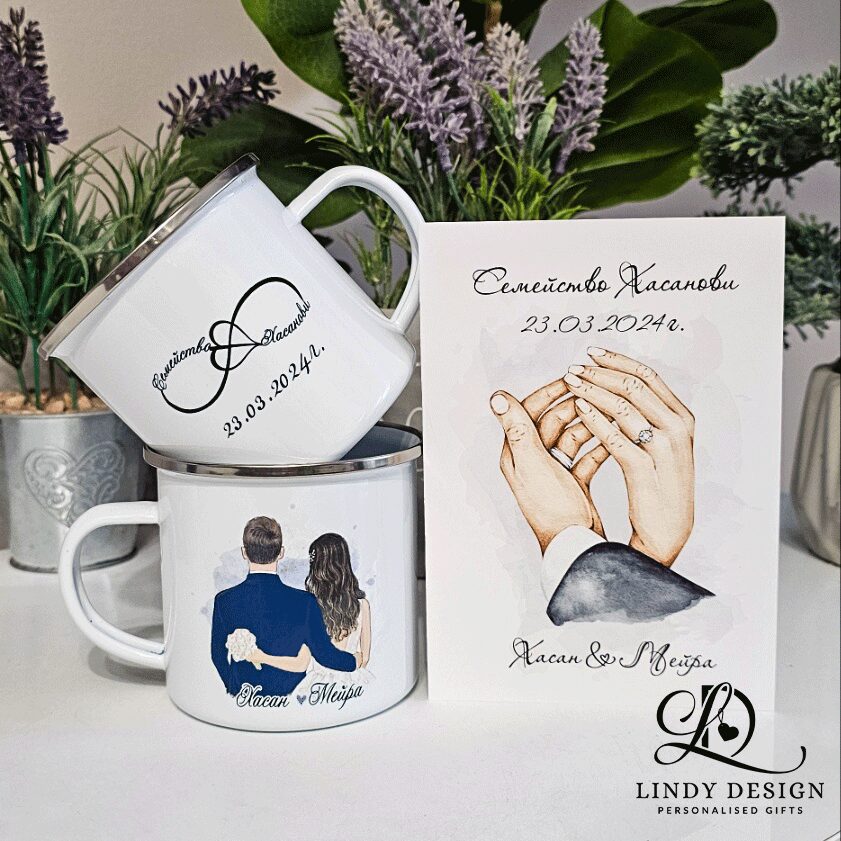 - Два броя персонализирано метално канче – може да изработим с всички дизайни от категория “Керамични чаши” . Подробности за продукта може да видите ТУК.