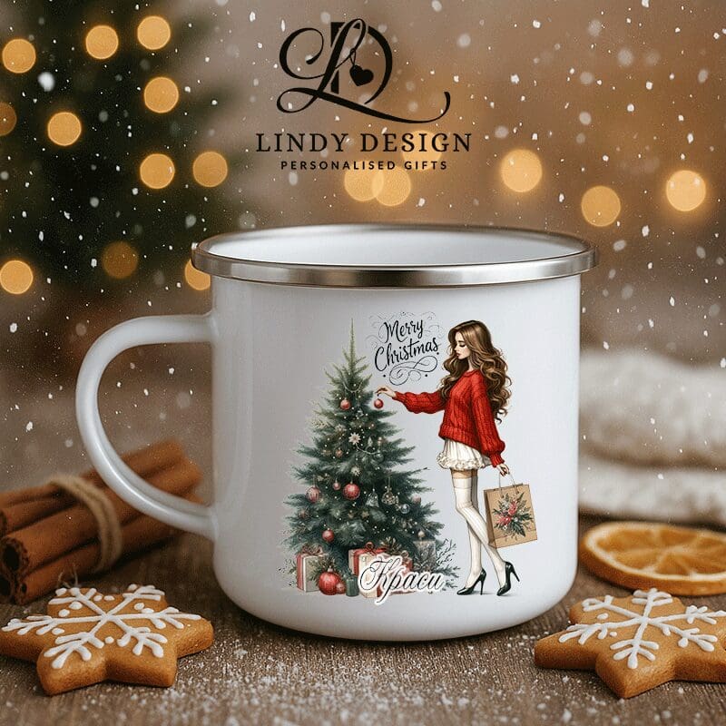 Дизайнът „Коледно момиче пред елха“ съчетава топлина, стил и нотка женственост в типичния празничен дух.