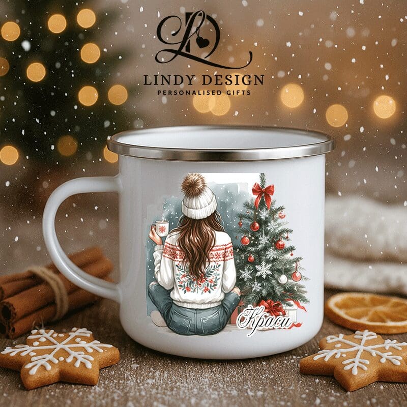 Коледата е най-уютният сезон от годината — време за аромат на канела, горещо кафе и дълги разговори с любимите хора. Емайлираното канче „Момиче пред коледна елха“ от Lindy Design улавя точно това настроение – топло, спокойно и изпълнено с малки радости.