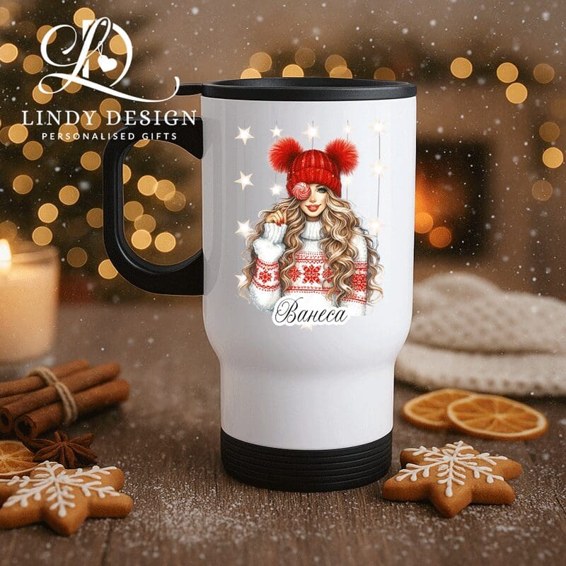 Коледна термо чаша “Момиче с близалка” – празничен стил в движение