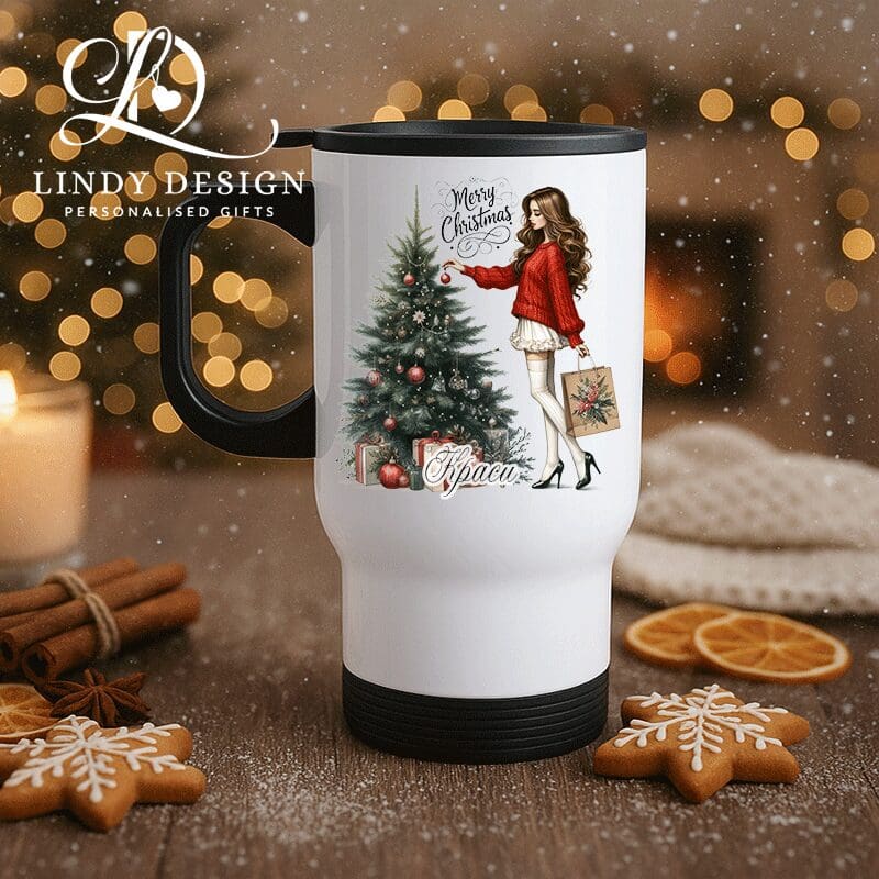 Термо чашата „Коледно момиче пред елха“ е идеална за кафе в движение, коледни пътувания или уютни моменти в офиса. Изработена от неръждаема стомана, тя съчетава практичност и изискан дизайн.