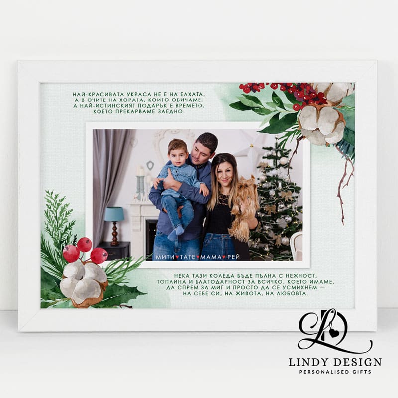 Всеки продукт се изработва индивидуално – качваш своя снимка, а ние я вписваме в дизайна с нежни коледни елементи и мек зелен фон.